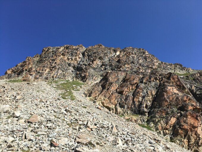 Vom Parkplatz Bunarivo auf 2000m folgt man zuerst dem Wanderweg bis Punkt 2106m danach weglos einem Zick-Zack-Pfad über Laviner dal Dschember Richtung Alp Secha 2553m. Von der Alp Secha gehts weglos auf die vorgelagerte Felswand oberhalb 2600m zu. Diese Felswand wird linkerhand über ein Band nach Osten gequert. Den "richtigen" Weg findet man anhand einiger Steinmänner und wählt dann den für sich am geeignetsten Aufstieg. Man folgt dem Südgrat mit einfacher Kletterei (II) oder umgeht einige Felsen auf der Westseite. Zum Teil findet man gelbe & orange Punkte, welche den Weg weisen vorallem im Abstieg sehr nützlich sind.