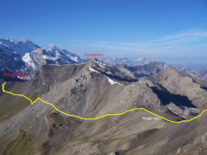 Imposanter Start auf dem Schilthorn 2970m. Einer der grossartigsten Rundblick- und Aussichtsberge in den Alpen. Wegweiser am Westrand der Aussichtsterasse. Nun sehr abwechslungsreich über den Grat nach NW absteigen (mehrere Halteseile, eine Metalltreppe) bis zum Sattel 2828m und weiter hinab zum Roten Härd 2683m. Hier verlässt man den weiss-rot-weiss markierten Bergweg und verfolgt den flachen Schuttrücken nach SW bis dieser am Hundshorn wieder leicht ansteigt. Nun nach SE ca. 80m in einen flachen, mit grossen Steinblöcken übersäten Boden absteigen. Ab hier ist die Route durchgehend, aber in unregelmässigen Abständen, mit Roten Punkten markiert. Leicht ansteigen auf eine grasige Schulter ca.2600m. Nun überblickt man das "Grosse Gstein" welches es nun zu überqueren gilt. (Achtung auf grosse, instabile Blöcke) Man bleibt dabei immer auf der Höhenline von ca. 2600 bis man wieder in grasige Hänge kommt. Nun auf ca. 2500m absteigen und immer auf etwa dieser Höhe bis in den Sefinenfurgge-Weg traversieren.