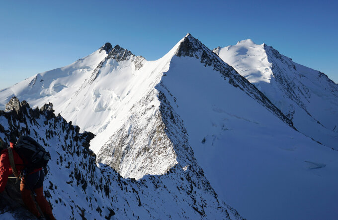Von dort ist es nicht mehr weit zum höchten der 4 Gipfel, dem Nadelhorn (4327m). Dazu kann man entweder über eine Firnflanke zur normalen Aufstiegsrouten queren oder über den Gendarme erreichen. Anschließend steigt man über die Normalroute zum Windjoch ab. Wer mag kann noch ein paar Höhenmeter zum Ulrichshorn (3925m) machen.