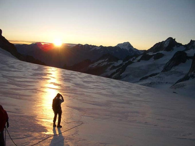 via die steile W-flanke (20m abseilstellen, abklettern bis III), anschliessend östlich der aig.adams reilly über den steilen und stark verschrundeten gletscher nach norden auf den glacier du tour. 2,5h
