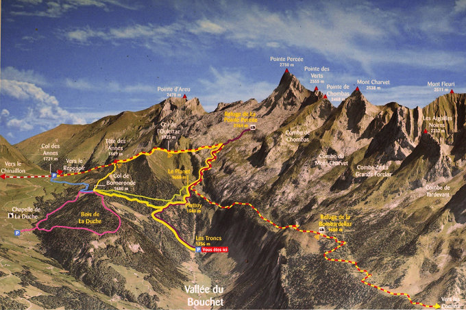 Ausgangspunkt der Tour ist der Parkplatz 'Les Troncs' (1256 m) im hintersten Winkel des Vallée du Bouchet, erreichbar ab Bonneville östlich von Genf über Le Grand-Bornand und Les Plans.
