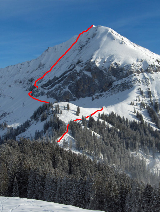 Abhängig von der Schneebeschaffenheit könnte vermutlich direkt vom Gipfel oder vom W-Grat durch eines der westlichen Couloirs abgefahren werden, spätestens auf ca. 1900m sollte aber über den Flühen nach E zum Aufstiegscouloir zurück gequert werden.