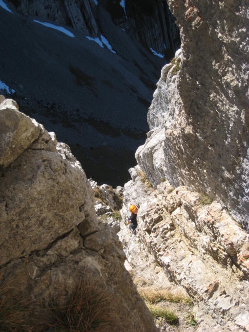 Die ersten zwei SL sind etwas grasig aber nicht schwer. Ab der ersten Höhle folgt schon die Schlüssellänge links ums Eck mit Quergang. Ab SL vier folgt die Route dann konstant während weiteren sieben SL einem Risssystem bis zum Ausstieg auf den Turm. Route ist gut abgesichert aber nicht klettergartenmässig. Ein paar kleinere Friends können in den Rissen gut eingesetzt werden.