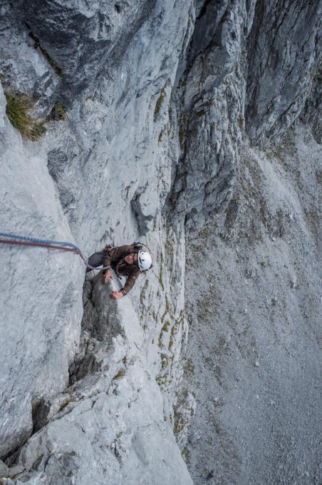 Ein sehr selten begangener Klassiker in bestem Fels, der zurückhaltend saniert wurde (Muniringe an den Ständen, ansonsten vorwiegend die originalen Schlaghaken und ein paar wenige Bolts).
