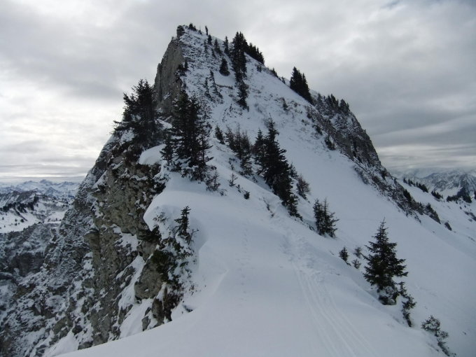 Abstieg auf oberem Drittel des Südgrats. Dann den Osthang hinab (30° Neigung, unten abflachend). Entlang dem Kamm mit steilen Nordabbrüchen auf ca. 1800 m Höhe haltend bis zum Geländeabfall auf die Göfiser (Gäviser) Höhe (1788 m) hinab (75 min.). An diesem Sattel befindet sich ein großes Holzkreuz. In 5 min. hinunter zur Göfisalpe (Gävisalpe, 1746 m). Dort zweigt südwärts der Pfad zu Neu- bzw. Altgerachalpe ab. Weiter nun durch den Wald südwestwärts, wo man auf den Güterweg gelangt. Bequem verliert man auf diesem in kurzen Serpentinen an Höhe bis hinab zu den Rossböden. Hier stößt man auf die Furkajochstraße (1,5 Std.) in deren Rechtskehre (Göfiser Kehre, 1410 m). Auf dieser links hinab nach Badegg (1213 m) wo sich eine dünne verbogene rot-weiße Schranke befindet und der Forsteg zur Aktenwaldalpe abzweigt. Von dort weiter zum Parkplatz (35 min. ab Göfiser Kehre).