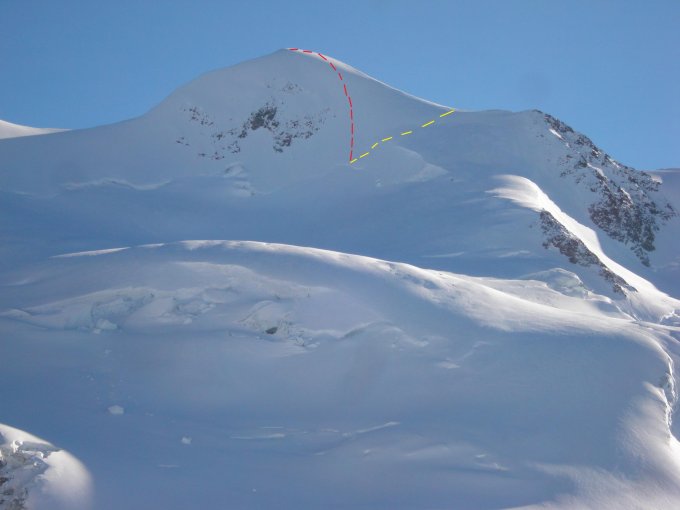 Ab hier der normalen Skiroute folgend, bis man auf den Nordwestgrat (P.3650) abzweigen kann. Hierauf folgt ein kurzer, aber vorsichtig zu bewältigender Abstieg zum Einstieg.