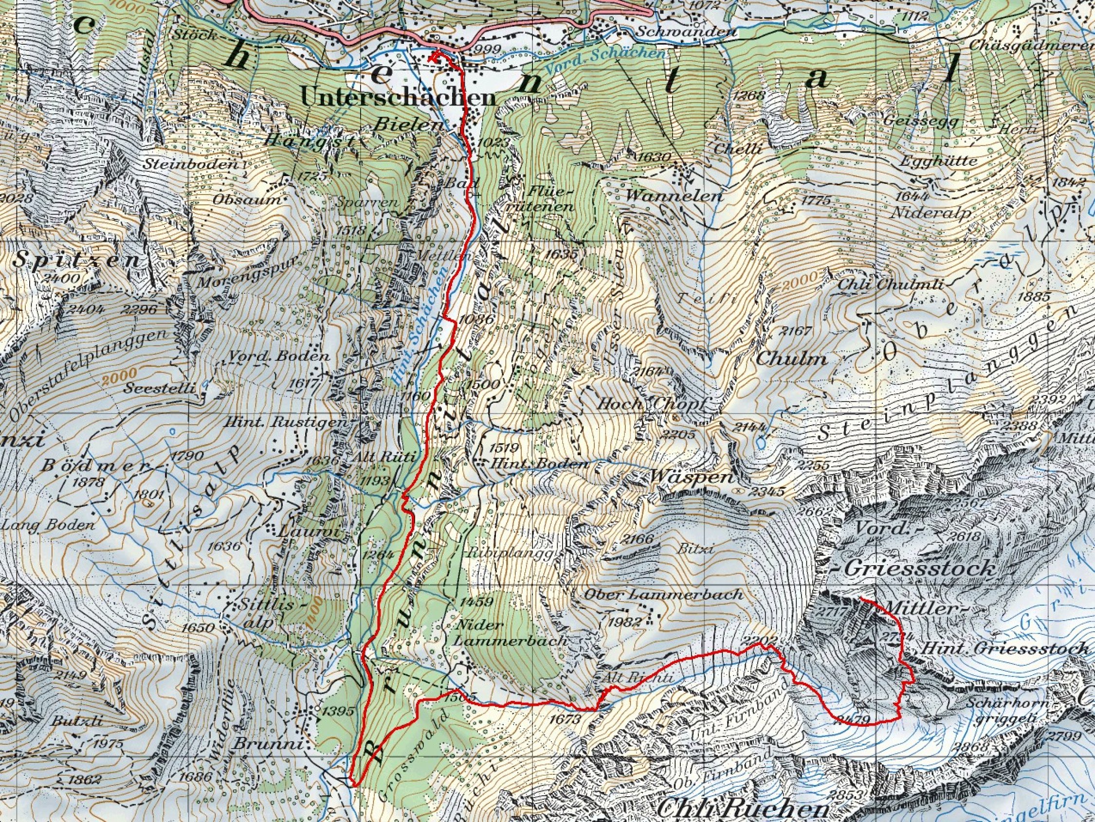 Von Griesseggen zum P. 2479 und über die steilen Südwesthänge und unter den Felsen des Hinter Griessstockes (ca. 39°) linkshaltend zum Grat und von da leicht zum Gipfel aufsteigen.