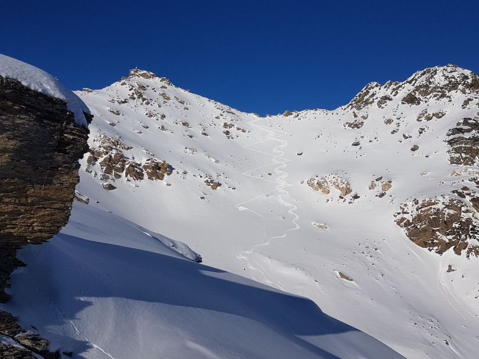 Links haltende über den Pass. Nun leicht abwärtsfahrend (mit Felle) und dann in nördliche Richtung auf eine kleine Terrasse östlich des Felskopfes P. 2742. Dem Hang folgend erreicht man die grosse SE-Mulde, welche in mässiger Steilheit hoch zum Gipfelaufbau führt.