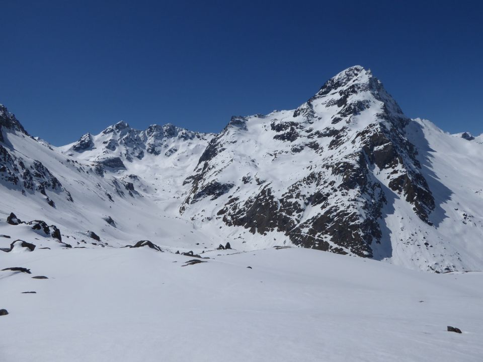 Unter der Staumauer den Dammschatten ausnützend hinauf bis zur Dammkrone, dann in licht bestocktem Wald nach Pra Miez; in WSW-Richtung in den Sattel zwischen Lajets und Muttans (P.2437); Abfahrt nach SW ins wüst und leer scheinende Val Bercla bis ca. 2220 m, Aufstieg über die Steilstufe nach Platta (guter Pausenpunkt mit Lawinensicherheit - Block!) und das Täli hinauf auf den kümmerlichen Rest des Vadret da Piz Platta; in einem Rechtsbogen nach Norden auf die Schulter westlich des Gipfelaufbaus und die steilen Hänge queren bis zum Skidepot unterhalb der Südrinne auf ca 3150m. Aufstieg mit Pickel und Steigeisen zum Gipfel. Abfahrt mit Skiern über das SO Colouir nur bei besten Verhältnissen möglich. Weiter unten Abfahrt wie Aufstieg. Aus dem Val Bercla wieder 200 m Gegenanstieg. Abfahrt bis nach Sur.