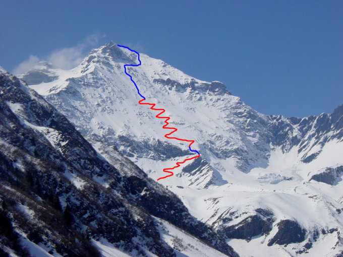 Weiter aufsteigen, bis zum Schneefeld (35-40°) direkt unterhalb des felsigen Gipfelaufbaus und dort auf gleicher Höhe bleibend nach rechts queren. Unterhalb eines Felssporns vorbei in das Schneefeld (40-45°) im rechten oberen Wandbereich wechseln. Hier entweder direkt aufwärts aussteigen (50°) oder nach rechts aus der Wand queren (45°).