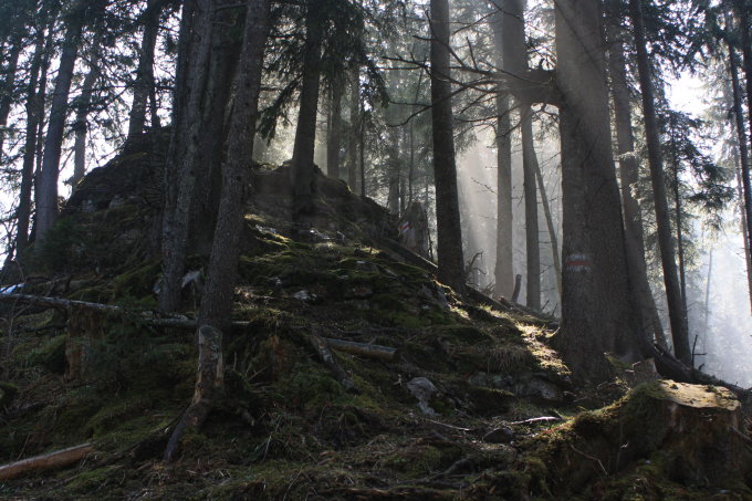 Wanderausrüstung und Stöcke. Nach Regen oder Schneeschmelze ist der Grat sehr rutschig!
