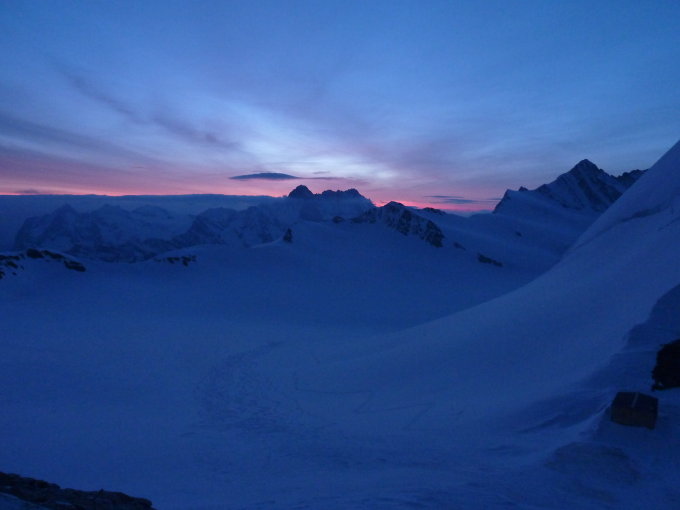 Aufstieg in einem weiten Bogen nach E ausholend hinauf zur Flanke, welche vom Fieschersattel herunterzieht. Will man zur Finsteraarhornhütte weiter, nimmt man die Ski mit hinauf, ansonsten Skidepot. Bis hier ca. 3 Stunden.