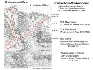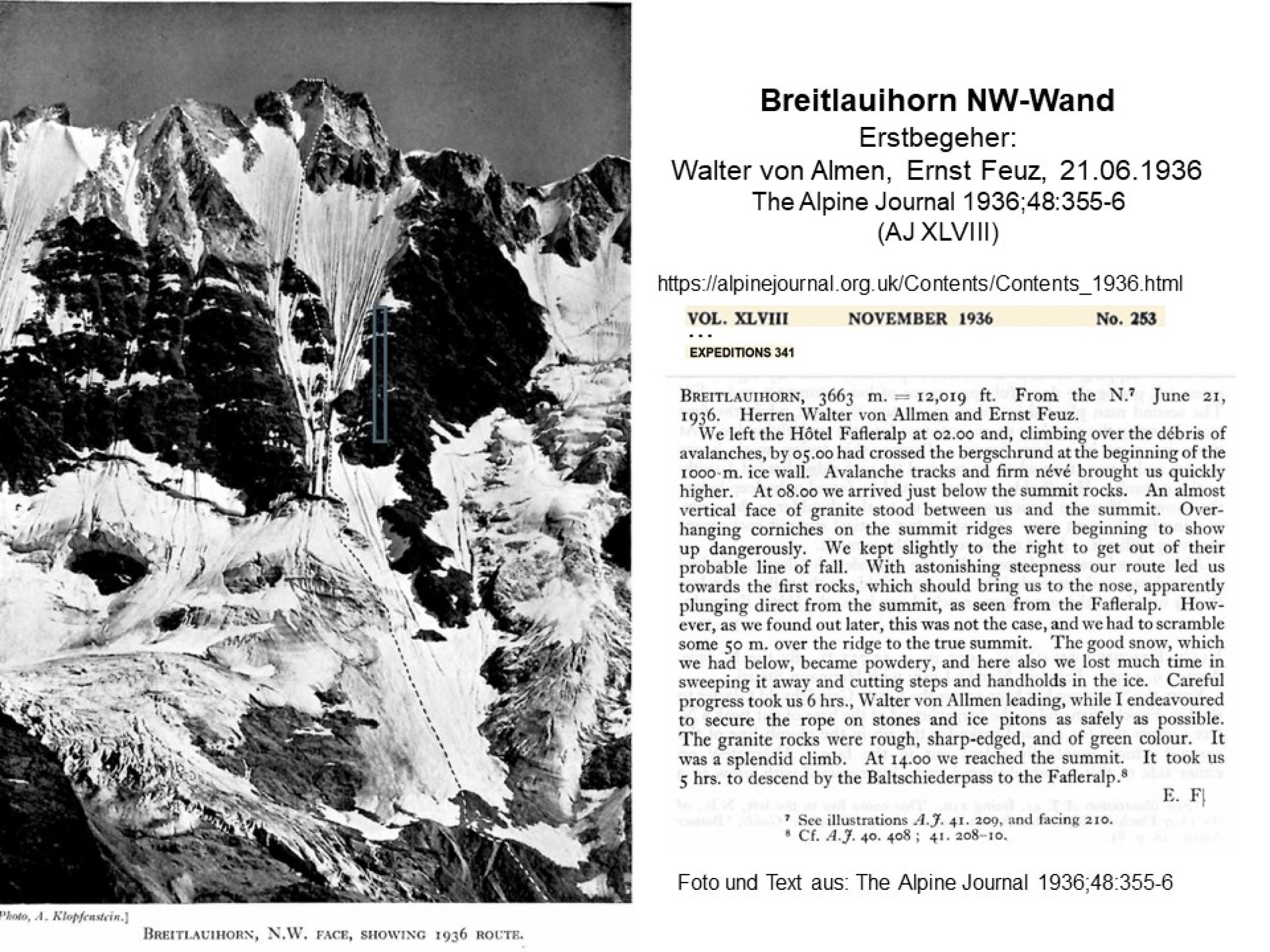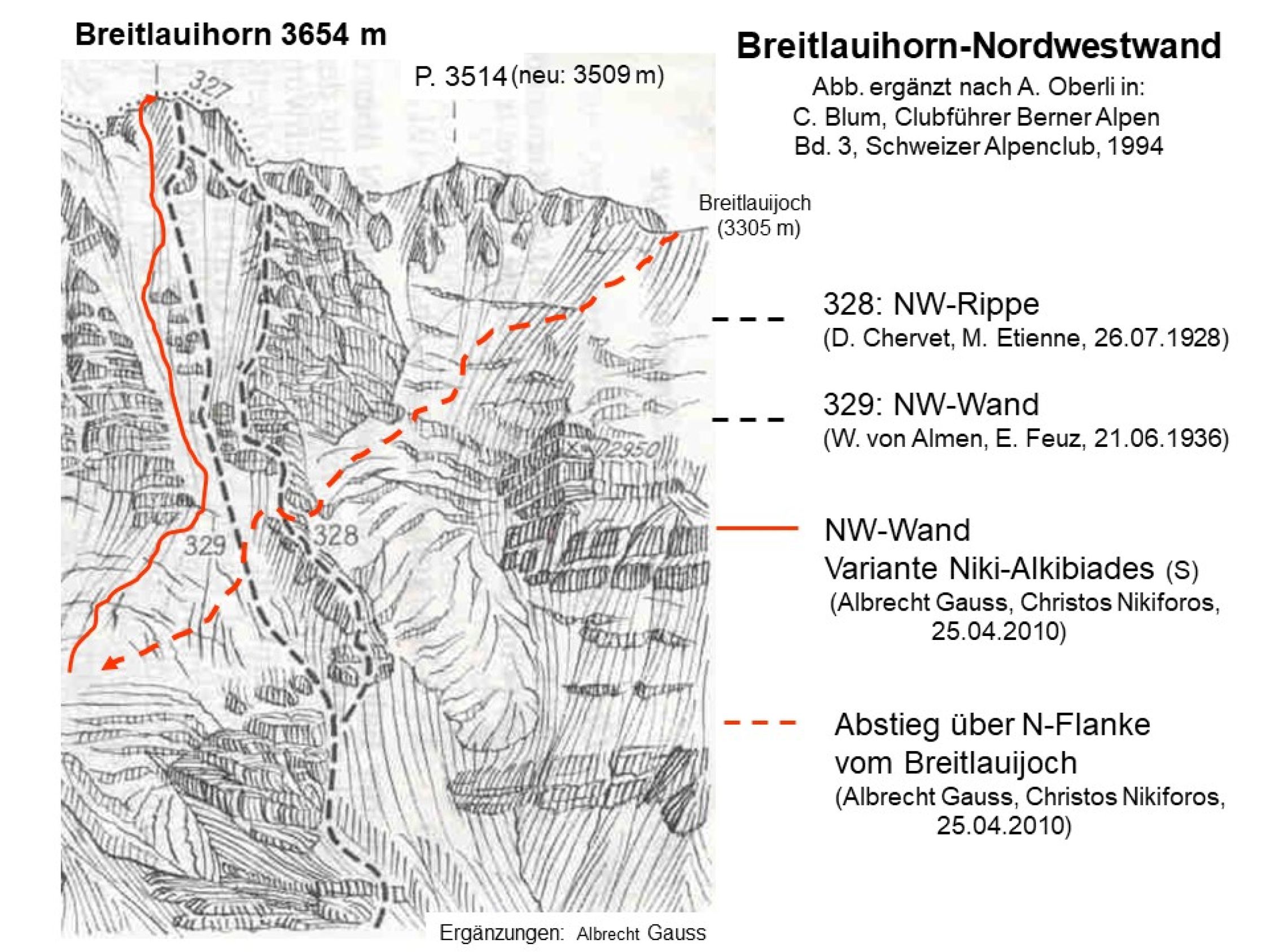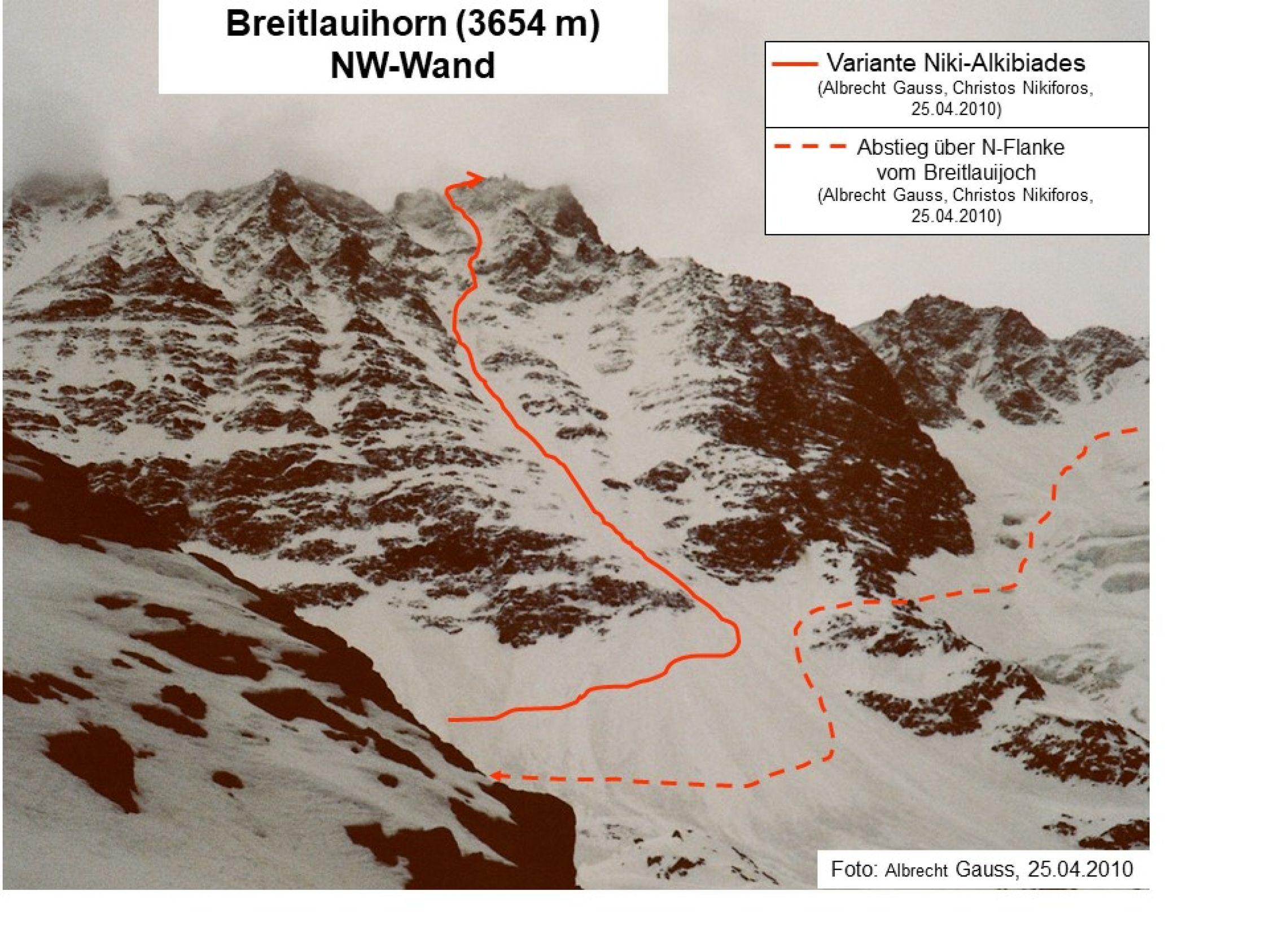 Der Abstieg vom Breitlauijoch nach NO ist in den bis 2010 verfügbaren Alpinführern (Blum Ch, Clubführer Berner Alpen, Bd. 3. Bietschhorn-, Lötschentaler Breithorn-, Nesthorn- und Aletschhorngruppe, Verlag des SAC, 1994; Munter W, Munter M, Berner Alpen, Gebietsführer für Wanderer, Bergsteiger und Kletterer, Bergverlag Rudolf Rother, München, 10. Aufl. 1995) nicht beschrieben. Auch eine Internet-Recherche ergab keine dokumentierte frühere Begehung dieser Route. Ob es sich bei der Begehung am 25.04.2010 um eine „Erstbegehung“ handelt, sei dahingestellt, wäre aber erstaunlich, da diese Abstiegsoption nach einer Begehung der Breitlauihorn-NW-Wand bzw. der NW-Rippe die schnellste Option zur Rückkehr zu den Ausgangspunkten der Tour (Flafleralp bzw. Biwakplatz auf ca. 2765 m im O vom P. 2784 m unterhalb der Gletscherspitza) darstellt.