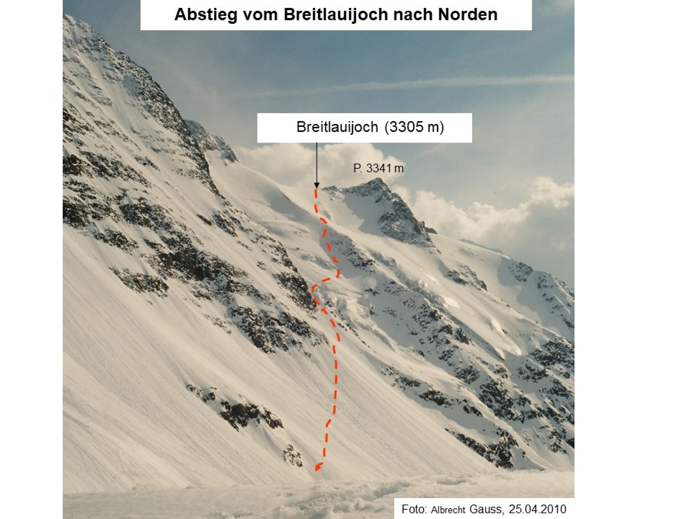 Von der O-Seite des Breitlauijochs nach NO absteigen bis auf den vom P. 2950 m heraufziehenden Firngrat. Diesen bei ca. 3200 m nach O traversieren und nach NO hinab (ca. 20 m 45–40°, ggf. Blankeis) und weiter nach rechts i. S. des Abstiegs solange abwärts steigen (ggf. zwischen Serakabbrüchen hindurch), bis auf ca. 2800 m der NW-Grat nach rechts (NO) querend überschritten werden kann. So erreicht man den untersten Teil der Eisflanke der NW-Wand und kann nun leicht wieder rechts haltend zu der Querung in Höhe von ca. 2660 m absteigen, um zum Biwakplatz auf ca. 2765 m im O vom P. 2784 m unterhalb der Gletscherspitza zu gelangen. Oder man kann direkt weiter hinab nach Gletscherstafel (1771 m) absteigen. Bei der Querung zum Biwakplatz unter den Gletscherspitza ist am Nachmittag die Gefahr von Nassschneerutschen-, lawinen aus der gesamten NW-Flanke des Breitlauihorns / Tyfelsgrates zu beachten.