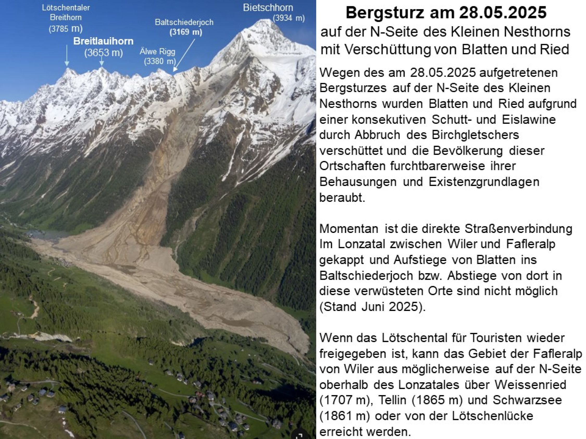 Beachte: Mit dem Bergsturz auf der N-Seite des Kleinen Nesthorns am 28.05.2025 wurden Blatten und Ried (s. Bild) aufgrund einer konsekutiven Schutt- und Eislawine durch Abbruch des Birchgletschers verschüttet und die Bevölkerung dieser Ortschaften furchtbarerweise ihrer Behausungen und Existenzgrundlagen beraubt. Somit ist die direkte Straßenverbindung im Lonzatal zwischen Wiler und Fafleralp bis auf weiteres gekappt. Der alte Direktabstieg nach Blatten vom Baltschiederjoch führt durch das Bergsturzgebiet und ist daher momentan auch nicht möglich.