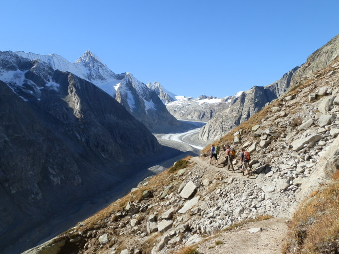 Von der Bergstation der Luftseilbahn auf breitem Weg zum Hotel Belalp. Abstieg über die “Steigglen” und über den alten Weg bis Punkt 2053. Dem Hang entlang auf die südliche, alte Moräne des Oberaletschgletschers. Weiter dem Pfad entlang hinunter in die eindrückliche Schlucht. Über die Brücke und hinauf auf die alte, nördliche Seitenmoräne. Nun über die Moräne hinauf bis an ihr Ende und steiler empor bis auf ca. 2600 m. Über den neuen Weg (2005 gebaut) zur Hütte. Die Wanderung ist 9.3 km lang.