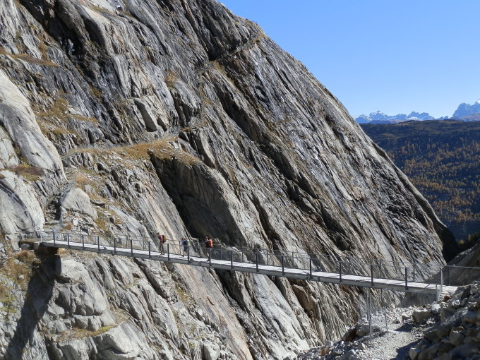 Von der Riederfurka (2065 m) durch den “Teiffe Wald” oder den Wanderweg “Silbersand” bis zum Grünsee runter (1614 m) dann über die neue 124 m lange Hängebrücke auf die Seite “Aletschji”. Von dort via “Leng Acher” zur Kappelle (1756 m) und weiter auf dem neu markierten Verbindungsweg bis man auf den Panoramaweg Oberaletsch (2000 m) trifft.