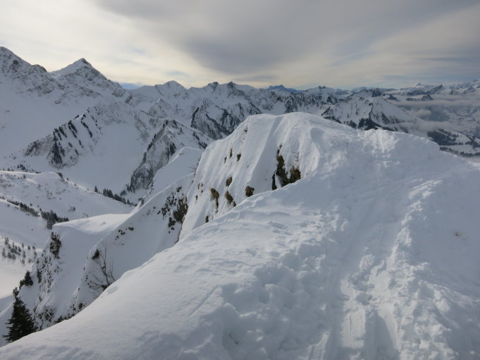 Abfahrt: Direktabfahrt durch den Nordwesthang nach Les Tservettes 1582m - auf die Alpe Les Baudes de la Metana 1362m - der Strasse entlang, teils mit Abkürzungen nach Grandvillard.