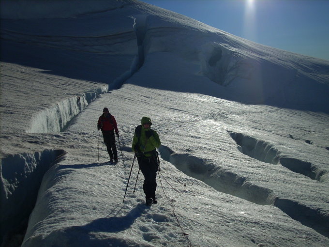 Nun geht man in suedlicher Richtung zum Grat Filo de la vieja. Dort angekommen steigt man in gleicher Richtung ca 50M auf den Manso Gletscher ab. Achtung: Bergschrund!