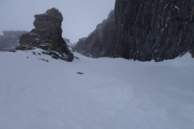 Das Couli ist über die ganze Länge min. 45° steil und weist in der Einfahrt zur Engstelle und in derselben eine Neigung von min. 50° - je nach Wahl der Route auch mehr - auf.
