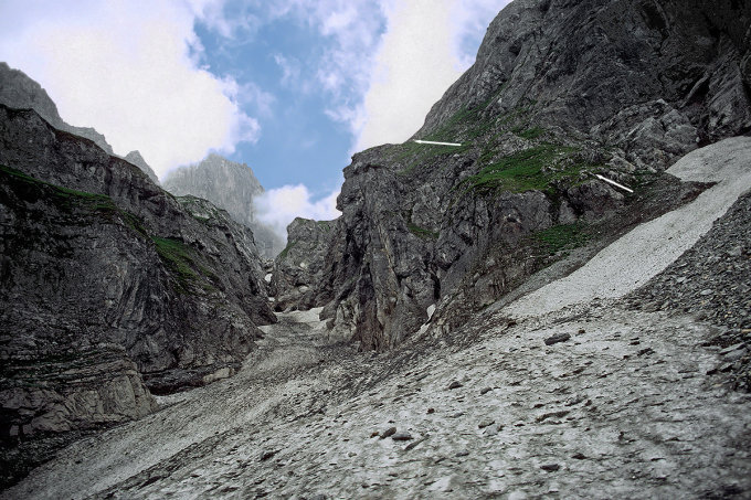 Die sich nun entgegenstellende Schlucht wird auf ihrer Nordseite über abschüssige, steile, felsdurchsetzte Grashänge umgangen. Tierwechsel erleichtern den Durchstieg. Man erreicht so den Kessel des Ochsentäli (2181 m).