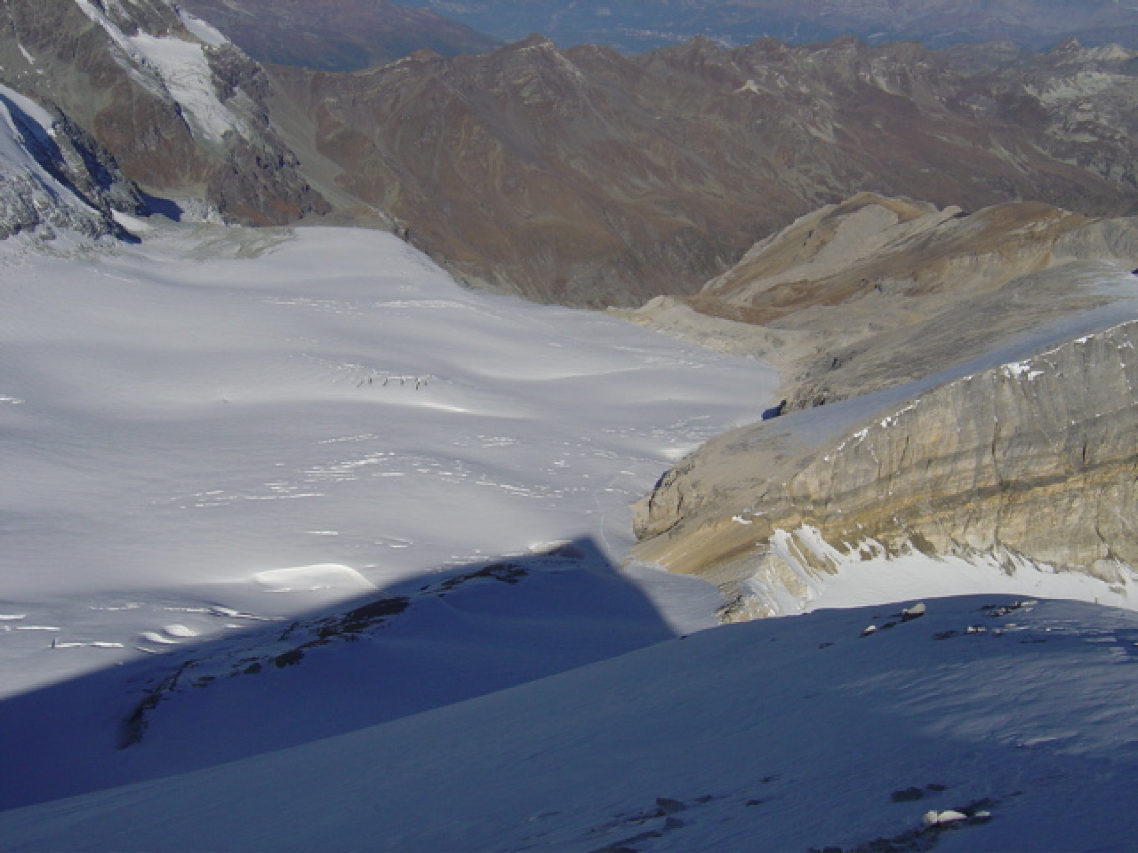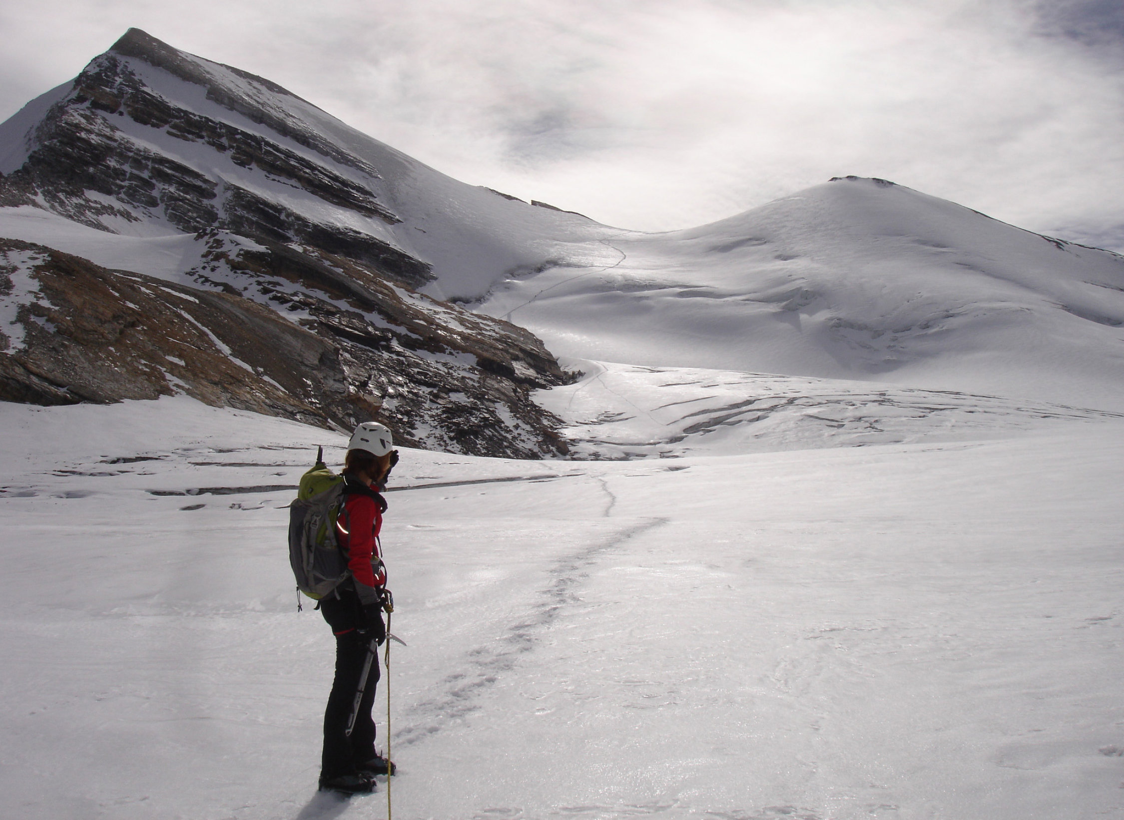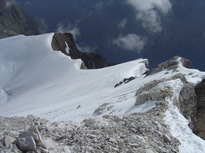 Von der Turtmannhütte auf einem guten Weg bis zum Gässi. Durch dieses hoch und weiter - der weiss-rot-weissen Markierung folgend - bis zum zweiten großen Steinmann. Hier den rechten, leicht abwärts führenden Pfad nehmen und - den Steinmännchen folgend - durch die Moränenmulde hinauf auf die rechte Seitenmoräne des Brunegggletschers steigen. Dieser Moräne bis unter das Chanzilti (P. 3071.9) folgen, bis man rechts auf den Brunegggetscher wechseln kann. Dem NE-Ufer des Gletschers und den Felsen südwestlich des Bruneggjochs folgen (Achtung Spalten). Nachdem man den Fuss der W-Flanke erreicht hat, peilt man das Joch (P. 3649) zwischen P. 3671 und Brunegghorn an. Je nach Verhältnissen muss man nicht bis ins Joch gehen, sondern kann in der steilen W-Flanke nördlich P. 3699 hochsteigen und den SW-Grat ca. 200 Meter vor dem Gipfel betreten. Andernfalls steigt man ins Joch und folgt dem Grat zum Gipfel (Achtung Wächten gegen Osten, im Spätsommer Wegspuren im Schutt). Abstieg über gleiche Route.