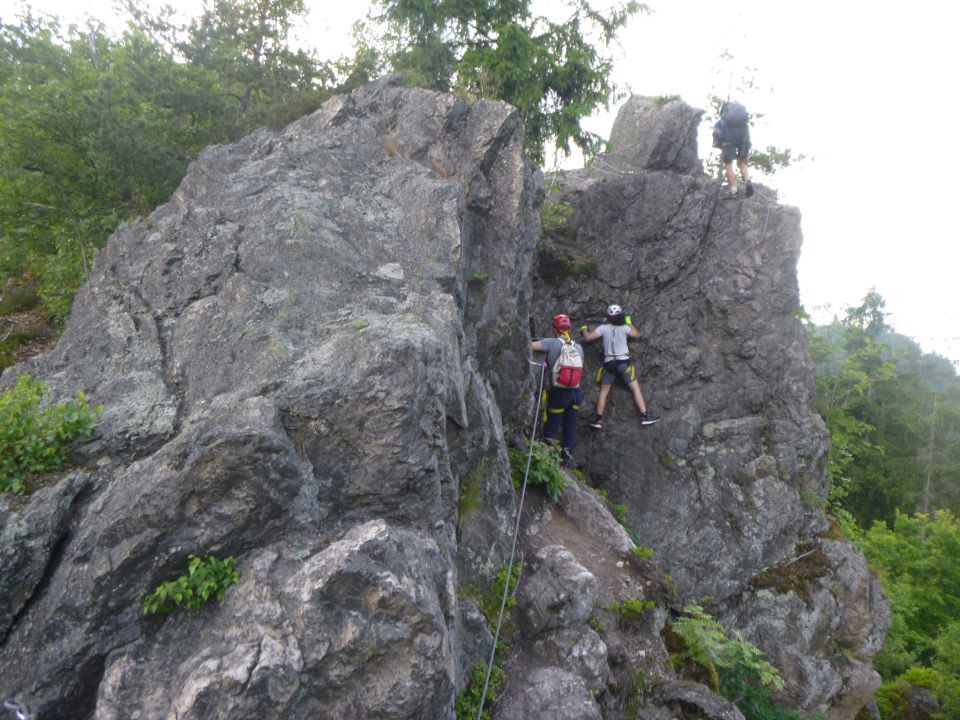 Nachtrag: 2023: Links neben dem einfachen Klettersteig gibt es nun einen ausgeprägten Abstiegstrampelpfad durch den Waldhang hinab, der mit textilen Seilen zwischen den Bäumen als Halteseil versehen ist, so dass man rasch und problemlos hinunter kommt.