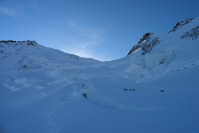 Mit den Gondeln/Lufseilbahn zum Klein Matterhorn 3883m. Ab hier diverse Möglichkeiten ein Gipfel zur Akklimatiastion aussuchen, Breithorn 4164m, Pollux 4092m, evtl. Castor 4223m. Anschliessend Abfahrt via Schwarztor 3731m auf dem Schwärzegletscher, anfangs eher in nordöstlicher Richtung zum Bereich beim Pt.3660 nun geradewegs runter zu den Gletscherabbrüchen z.T. durch die Brüche abfahren. Wer mag hat die Möglichkeit auf 3160m einen ca 30min Aufstieg zum Klein Pollux 3306m (sehr gute Übersicht ins Monte Rosa Gebiet) zu machen. Abfahrt auf dem Gletscher bis anfangs Gornergletscher und Aufstieg zur Monte Rosa Hütte.