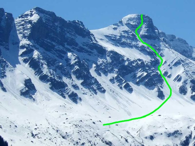 westlich von pt.2385 steigt man in das couloir ein, das auf eine scharte im grat zwischen den pt.2686 und 2886 leitet. wir trugen die skis hoch bis links des grossen felsriegels, wo wir das depot errichteten. nun verlässt man das couloir leicht rechts haltend, umgeht einen kleinen felsriegel und steigt hinter diesem hoch, um direkt unter die gipfelfelsen zu gelangen. bis hier bei guten verhältnissen seilfrei. eine lästige und schlecht absicherbare seillänge führt in brüchigem fels auf das kleine gipfelschneefeld. in wenigen metern zum vorgipfel und danach leicht auf den gipfel.