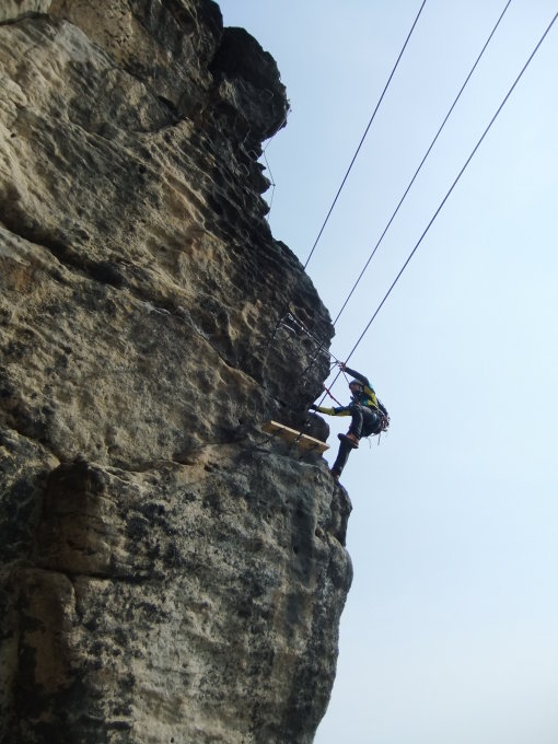 Von der Sitzbank neben dem Wandbuch über kleinen Felsspalt nach links zur leicht übergeneigten Wand. An deren Kante auf Eisenbügeln des KS Frona 4 m hoch. Dann links um die Felskante herum zum Standbrett von der im November 2014 gebauten 3-Seil-Brücke. Auf dieser wird eine große Felsbucht überbrückt. Am anderen Ende stößt man dann auf das Seil vom KS Via ferrata Cesta do Nebička. Auf diesem weiter über die Metall-Leiter zum Ausstieg (30 min.). Hinter diesem befindet sich eine Aussichtsbank (Ausstieg).