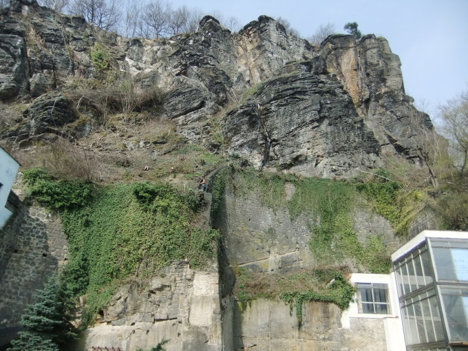 Schwierigkeit: tschech. C/3+; KS4: Diese war die erste Route, welche im Mai 2014 von Karel Bělina gebaut wurde von unten bis ganz rauf. Der Einstieg beginnt im Winkel der L-förmigen Mauer auf Eisentritten (Bügel und Stifte) 4 m gerade hoch bis man auf links hochgehende Steintreppen trifft. Nach diesen dann rechts herum über kurzes Gehgelände zu großen, breiten Graspodest. Man steht hier auf dem Dach des Eisenbahntunnels der Zugstrecke Dresden - Prag, von wo die weiteren Routen abzweigen.