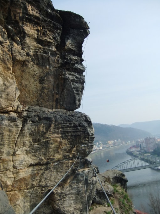 Von der Sitzbank neben dem Wandbuch über kleinen Felsspalt nach links zur leicht übergeneigten Wand. An deren Kante auf Eisenbügeln der 2014 gebauten Route direkt hoch. Am Linksabzweig der KS-Passage Karlúv most vorbei. Schlüsselstelle ist am Schluß: Eine dynamische Passage zum letzten Eisenbügel in voll überhängender Position. Das Umkarabinern dort will vorher überlegt sein, ohne zu lange Kraft zu verlieren. Ausstieg ist schräges Grasplateau rechts neben der Aussichtsbank (10 min.).