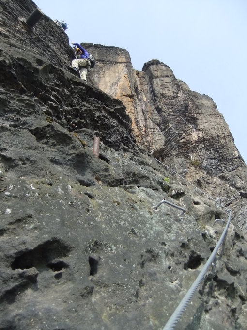 Schwierigkeit: tschech. B/2+; KS4: Von unterem Grasabsatz rechts haltend zu runder Bergkante. Rechts neben der Via ferrata Cesta do Nebička beginnt 2014 fixiertes Stahlseil und zieht schräg rechts hoch durch die Wand zu schräger Kante. Auf dieser direkt hoch zur Sitzbank und dem Wandbuch (15 min.).