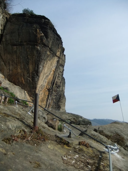 Schwierigkeit: tschech. D/4; KS 6: Wie der KS Stříbrna vùle zum Anfang des Kamins. Dann jedoch rechts von diesem ausgesetzt in die Wand rechts hinaus queren. Ohne technische Hilfsmittel (reine Felskletterei im IV. Grat) an durchgängigem Seil (2014 fixiert) gesichert an linkem Wandpfeiler.zum Ausstieg auf dem rechten Grasplateau vor dem weißen Schloß (30 min.).