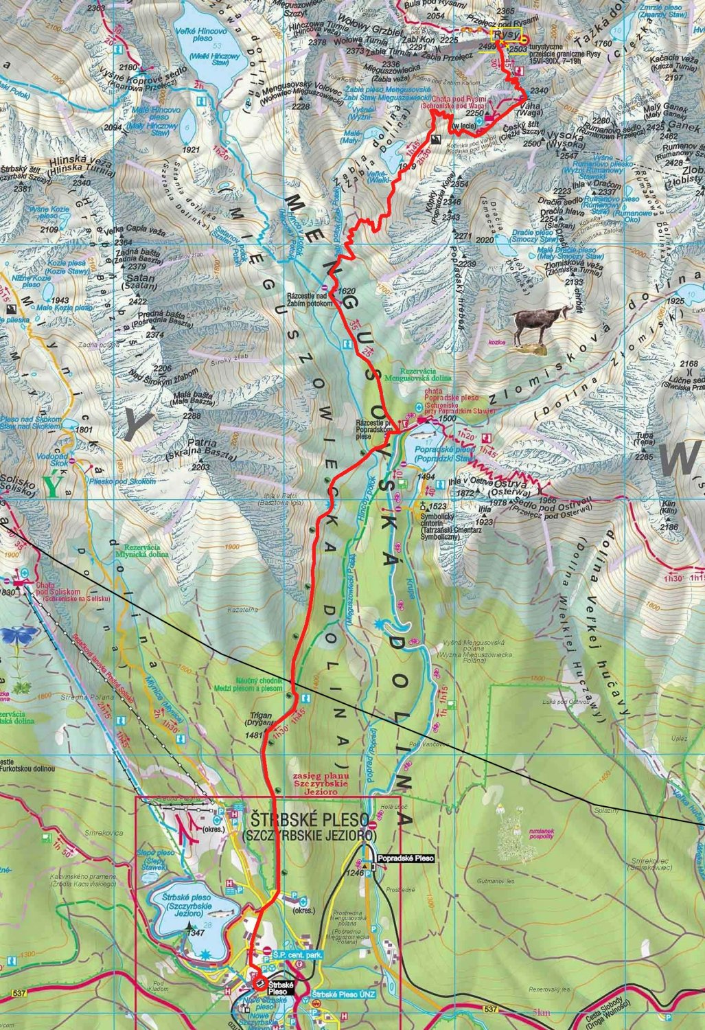 Von Štrbské Pleso (1340m) wandert man durc Bergwald über die Kuppe Trigan (1481m) bis kurz vor die Abzweigung beim Popradské Pleso (1400m), 60-90 Minuten. Nun läuft man taleinwärts bis zur Abzweigung Rázcestie nad Žabím Potokom (1580m), 30 Minuten. un wird der Weg steiler und man erreicht in zahlreichen Kehren den Hochtalkessel Žabía dolina (1920m), 60 Minuten. Nordöstlich des Kessels steigt man die Flanke hinauf zu einer Felsstufe die über einen gesichten Steig überwindet wird. Danach wandert man ein Gerölltal, an der Hütte Chata pod Rysmi vorbei, hinauf in den Sattel Sedlo Váha (2339,7m), 90 Minuten. Über den Rücken und zuletzt durch die Südwestflanke erreicht man den Nordwestgipfel (2498,7m), 30 Minuten. Von dort über den Grat in wenigen Minuten auf 2503,0m hohen Hauptgipfel.
