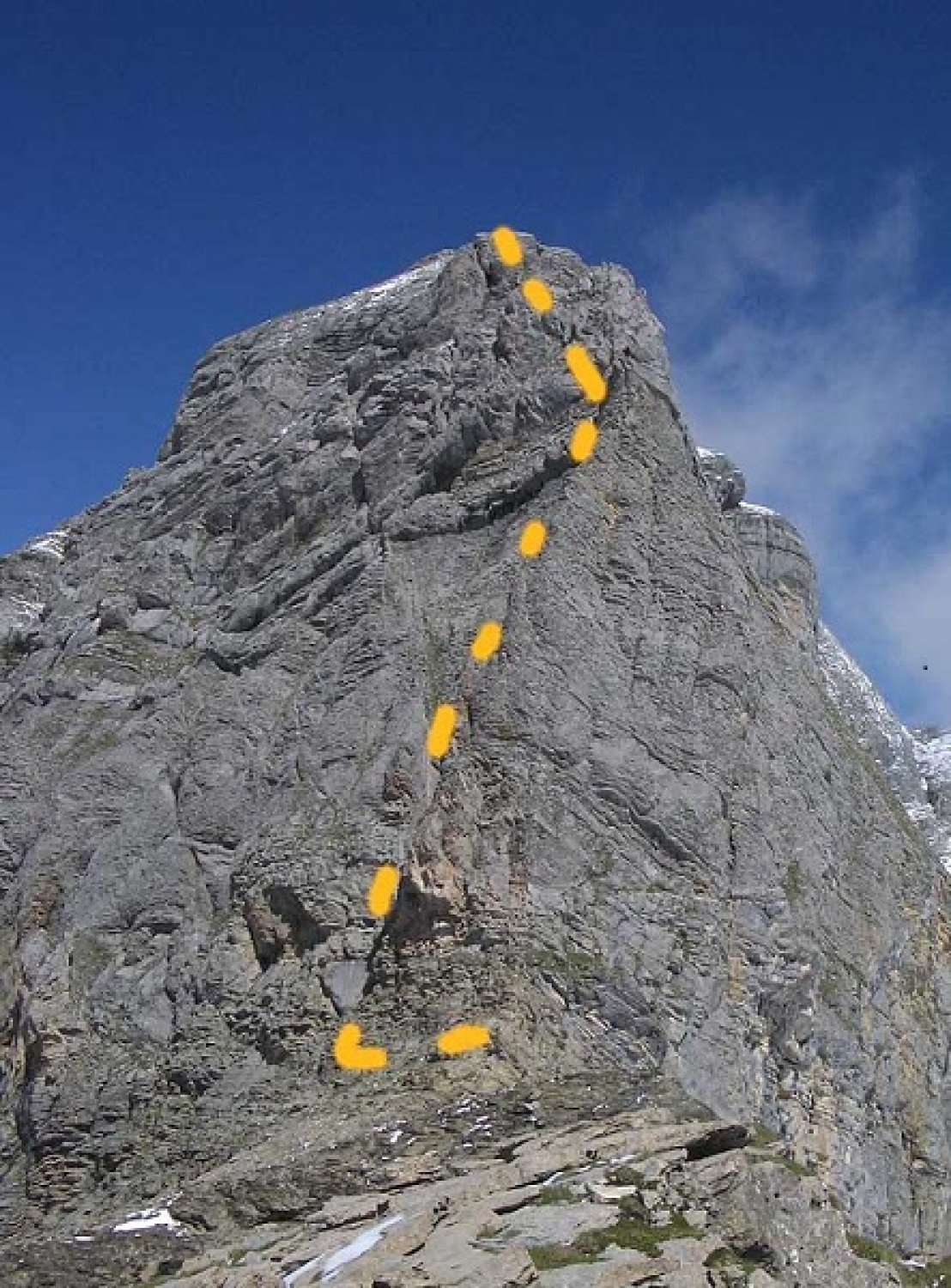 circa 25m links der kante setzt eine markante, von weitem gut sichtbare rinne an, man verfolgt diese bis auf den sattel hinter dem ersten gratturm. der einstieg stellt wohl gleich die schlüsselstelle dar (1 hk), der die rinne abschliessende überhang ist erstaunlich einfach zu klettern (2 hk). III+