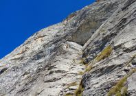 Von der Paliis Nideri 10 min auf waagrechtem Band (Schnürliweg) nach O zum Einstiegsplatz (flache Grasschulter): ausgesetzt, aber mit Drahtseil versichert (vorher Gurt anziehen und wie Klettersteig gehen - Schwierigkeit A/B).