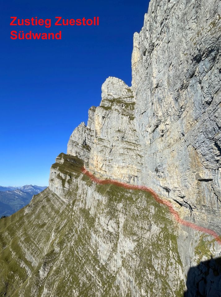 Von der Paliis Nideri 10 min auf waagrechtem Band (Schnürliweg) nach O zum Einstiegsplatz (flache Grasschulter): ausgesetzt, aber mit Drahtseil versichert (vorher Gurt anziehen und wie Klettersteig gehen - Schwierigkeit A/B).