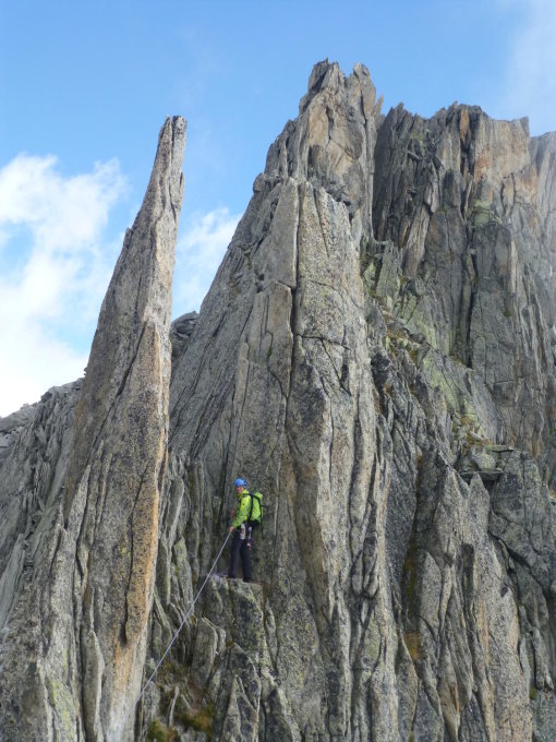 in 2 SL, Einstieg mit Steinmann markiert auf den Grat hinauf, dann diesem folgend, Felsnadeln werden teilweise seitlich umgangen; Haken sind vorhanden, die Standplätze sind jeweils mit 2 Sicherungspunkten ausgestattet; Zusätzlich Bandschlingen mitnehmen, ev. Friends; an einer Stelle muss technisch geklettert werden, kann aber auch links umgangen werden! Schön