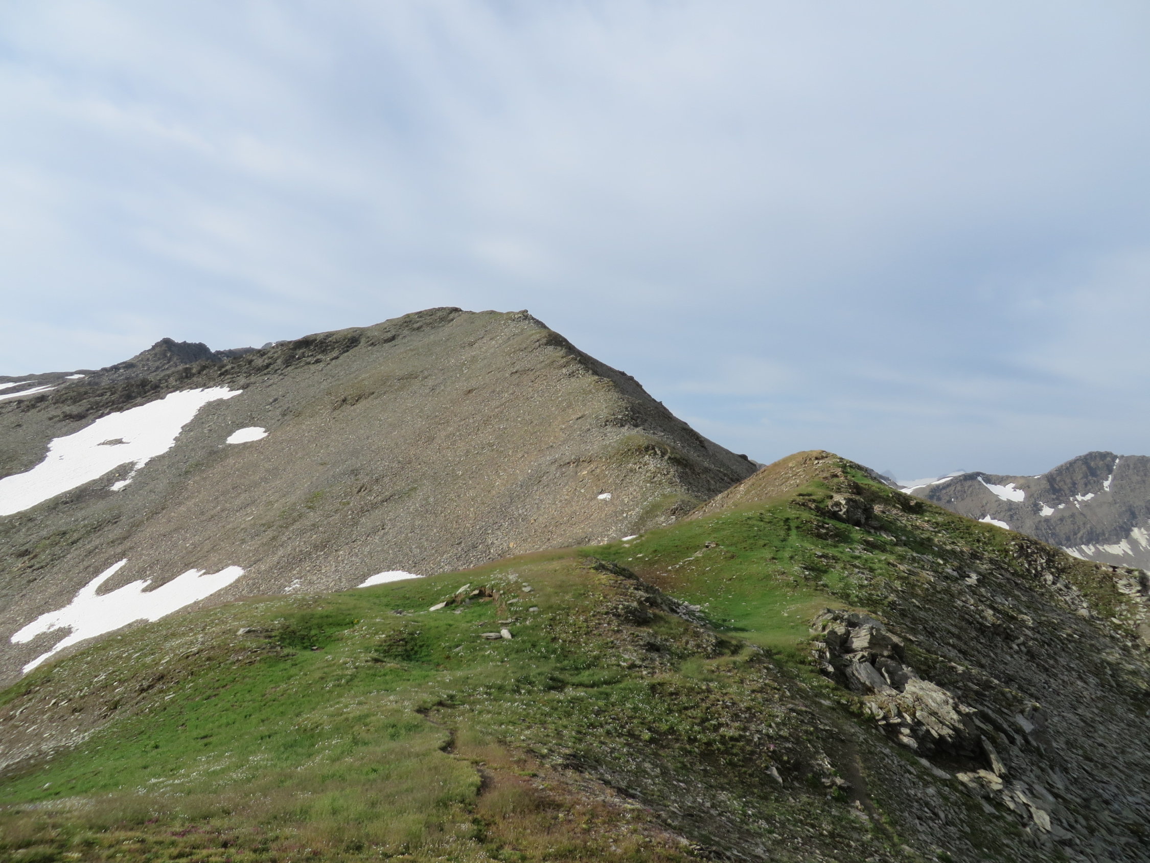 Vom Blauberg geht immer auf dem Grat stetig auf und ab Richtung Blaubergpass. Die Wegfindung ist ziemlich einfach. Zum teil ist es recht lose und man sollte schon trittsicher sein.