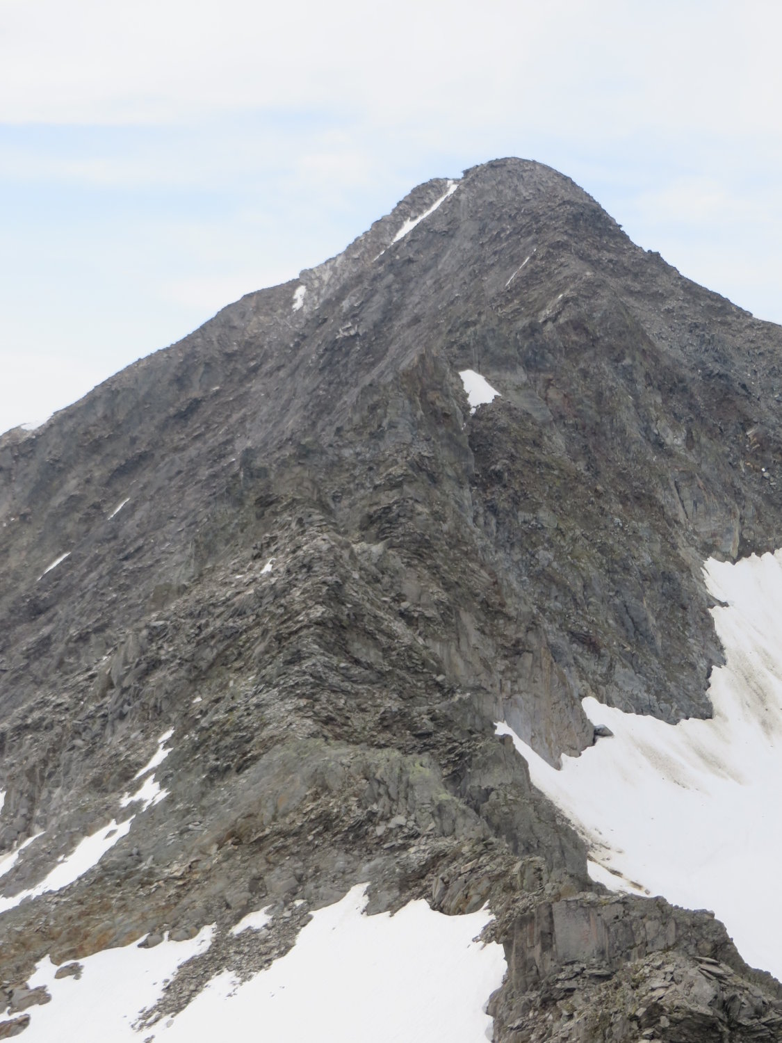 Vom Blaubergpass fängt der schwierigste Teil an. Der nun scharfe Grat führt zu einem ersten Gendarm, der rechts umgangen wird. Den folgenden Turm kann man auch rechts umgehen oder laut Führer überschreiten und an einem Haken 20m abseilen. Nun leiten geborstene Felsen zum Gipfelkreuz.