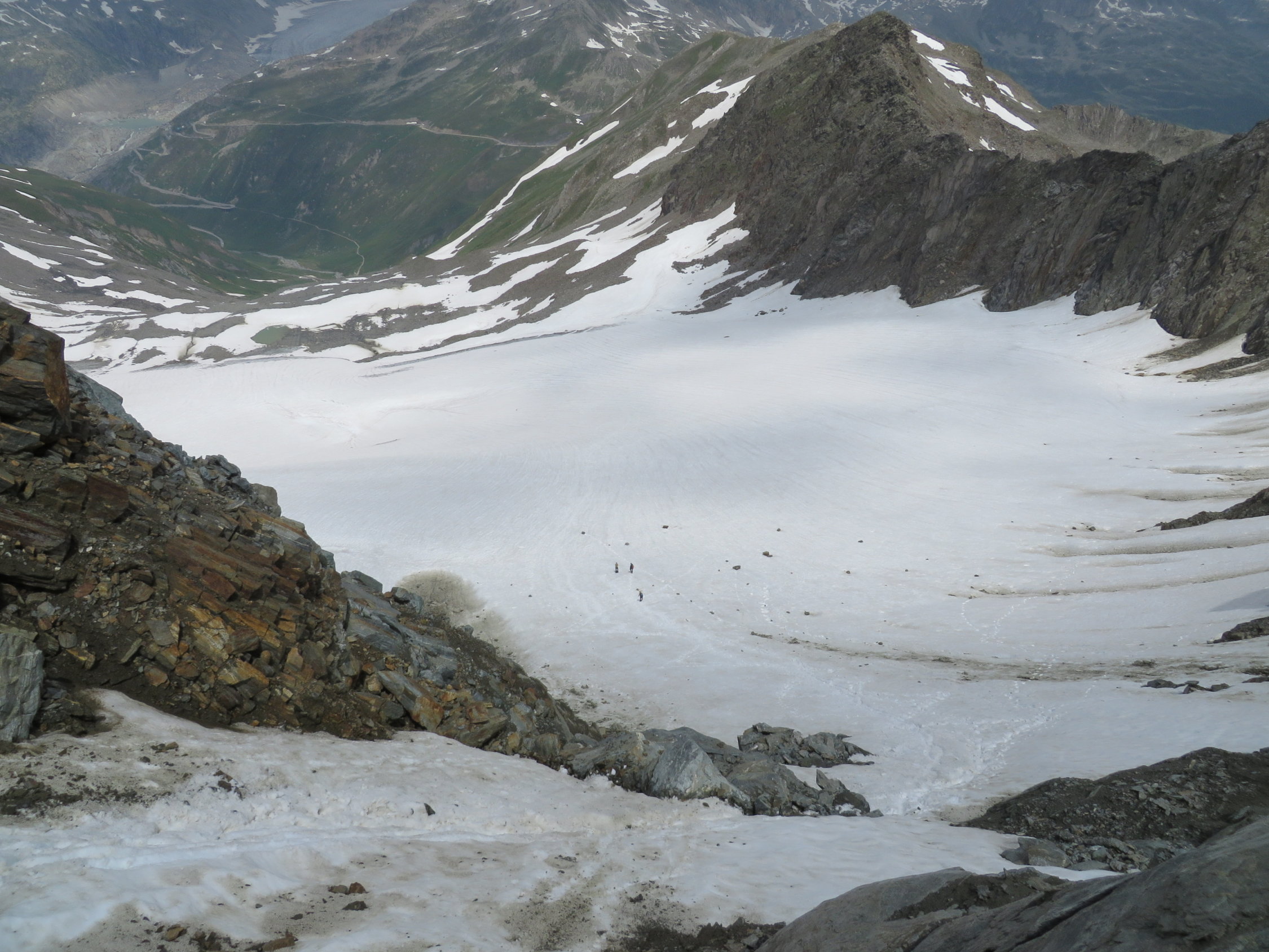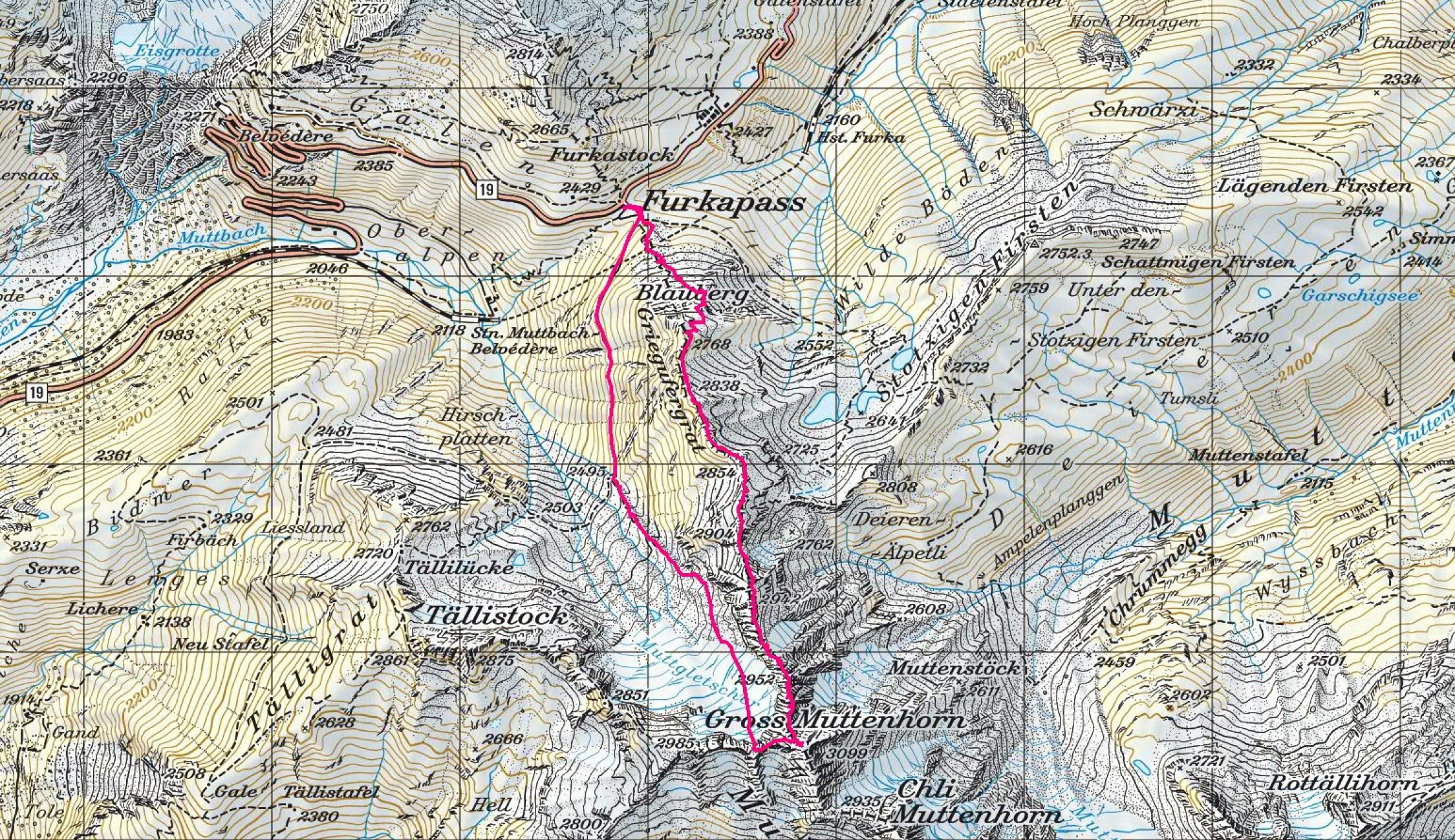 Auf dem Westgrat bis zum P. 3005 und über eine Rinne auf den Gletscher runter, kann bei Ausaberung heikel sein. Nun auf dem Muttgletscher zur Moräne und über Wegspuren zum Steg bei P. 2495 und auf dem Strässchen zurück zum Furkapass.