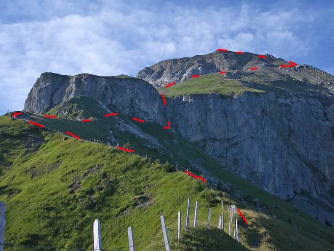 nun mehr oder weniger alles dem grat entlang in steiler kletterei auf den barglen (2669m), der erste überhängende turm wird links, der zweite und dritte rechts umgangen. hie und da kletterei an fantastischem fels, doch gleich viel kletterei auch an heiklem, brüchigem fels; einige schlaghaken, eine gedenktafel. (IV-, 1 1/4h)