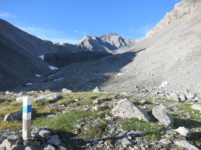 Von der Chamanna aus auf w-b-w markiertem Weg hinunter zum Plan Valletta; P.1835. Weiter auf markiertem Bergweg, der dann auf ca. 2050 Meter zu einem Pfad übergeht. Über 2 Steilstufen mit teils losem Gestein hoch bis zur letzten Markierung beim P.2469. Von da an den Steinmänner folgend das Tal hinein bis zu einem unübersehbaren fast hausgrossen Steinblock. Weiter durch losen Schutt zum P.2985 und über den N-W Grat zum Gipfel. Abstieg erfolgt über N-O Grat durch die Nordwest Mulde zum grossen Block und gleich zurück zur Chamanna.
