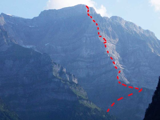 der offensichtliche einstieg weist zusätzlich einen stand aus schlaghaken auf. direkt über den steilen grat hinauf, durch eine schlucht nach links, um anschliessend schräg rechts haltend wieder den grat zu erreichen. gerade über die nächsten steilstufen, die ständig wieder von kleineren oder grösseren geröllbändern unterbrochen werden. die schwierigen passagen werden immer wieder in rissverschneidungen angegangen, die schöne kletterei in gutem fels aufweisen (V). hingegen bieten die leichteren passagen eher unzuverlässigen fels an. nach der dritten rissverschneidung gelangt man wiederum auf ein band unter einer mächtigen steilstufe in flechtigem fels. man wendet sich ca. 50m nach rechts (steinmann), wo man diese steilstufe wieder links zurücksteigend leicht umgehen kann. hier endet der helle graue kalk, es beginnt der letzte drittel in braun-rotem, sprödem fels. in der gerade oberhalb ansetzenden unangenehm "gschüdrigen" schlucht führt ein fixseil. wir zogen es vor, weiter nach links zu queren, um auf der linie der erstbegeher weiterzuklettern. ein brüchiger grat, unterbrochen durch scharten und kurze wandstellen, führt nun über ca. 300 hm an die kurze gipfelwand. vor allem die ersten zwei seillängen weisen steile, heikle kletterei auf. nach zwei scharten und einer weiteren wandstelle legt sich der grat zurück, von einem kleinen turm kann abgeseilt oder steil abdrängend abgeklettert werden (heikel). so erreicht man die gipfelwand, die nochmals schönen grauen kalk aufweist. zunächst zwei seillängen schräg rechts aufwärts, um die beiden kurzen überhänge linkshaltend zu erklettern (IV) und so den gipfelgrat zu erreichen. 7,5h