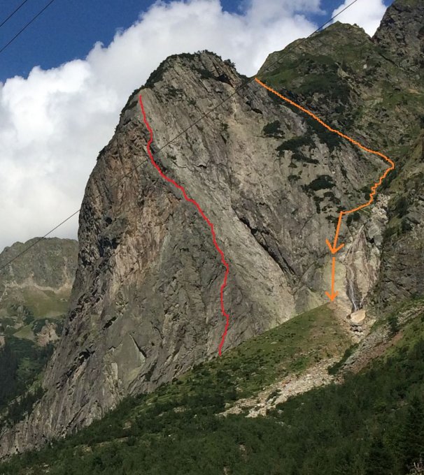 Die Route startet etwas 40 Hm unterhalb der Einstiege der Südwandrouten. Sie ist am Einstieg angeschrieben.