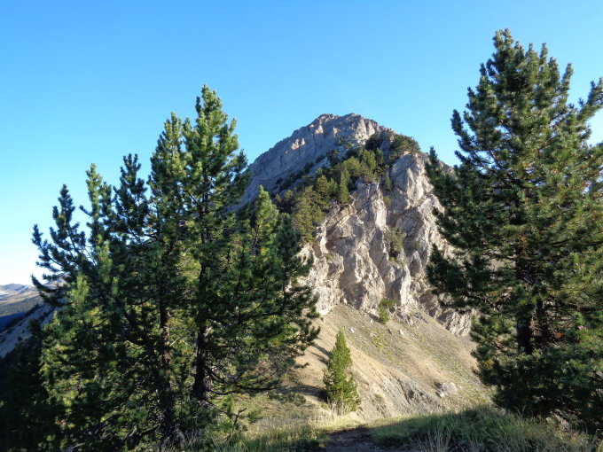 Nun weiter bergwärts auf einem sehr guten Wanderweg die waldige Crête de la Pinée hinauf. Beim verlassen des Waldes stösst man auf eine alte, kleine Festungsanlage und geht nun weiter, immer in der Nähe oder auf dem Grat zum Serres des Aigles 2567m. Nun dem wunderschönen Grat mit grandiosem Ausblick folgend auf den Petite Peyrolle und weiter in den Sattel zwischen Grande Peyrolle und Petite Peyrolle. Nun den kurzen, leicht steileren Anstieg zum Grande Peyrolle.
