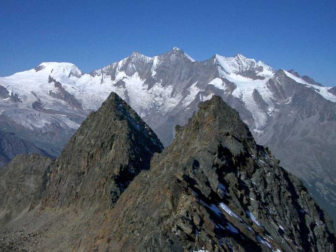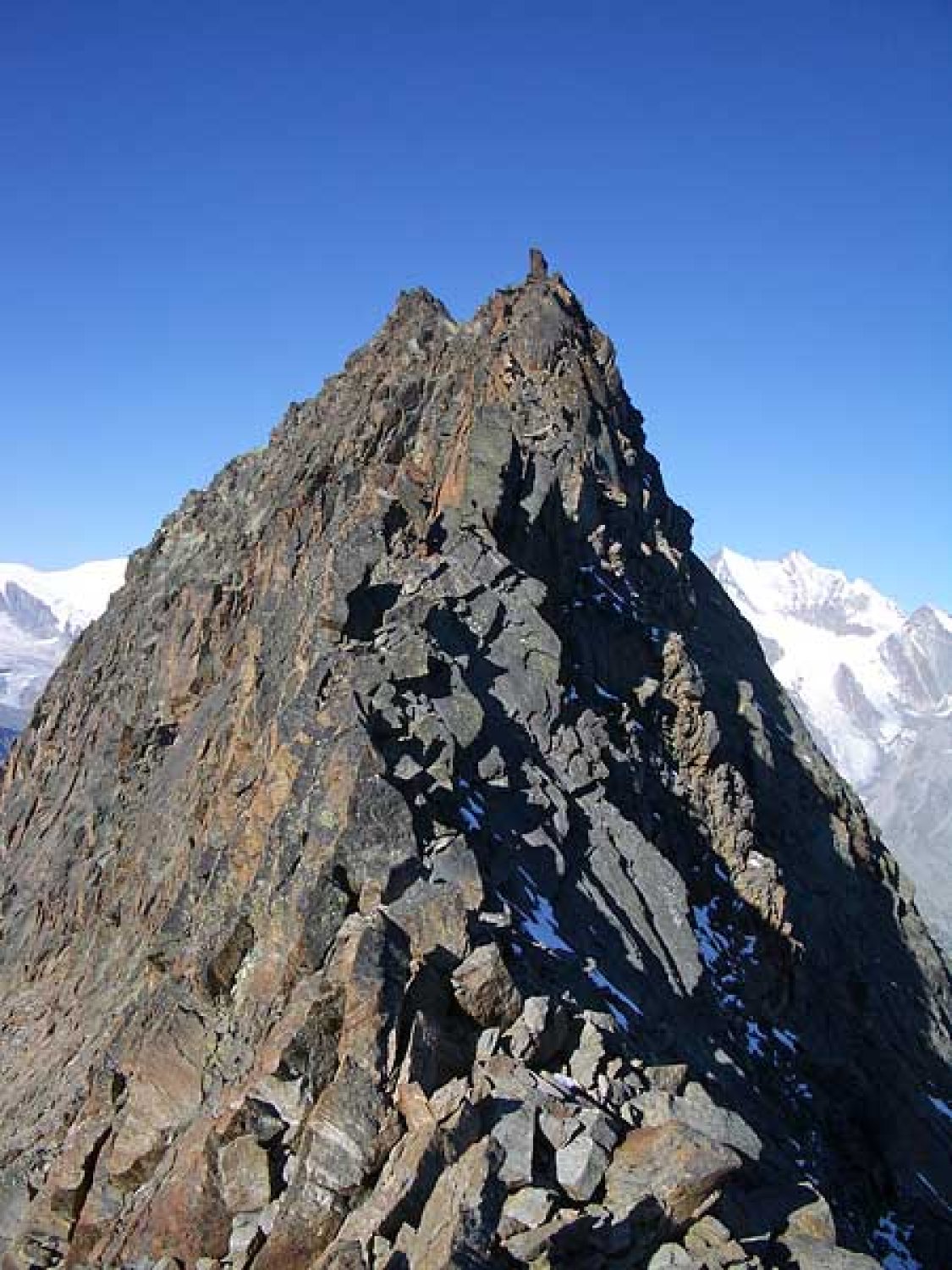 als abstieg bietet sich der SSE-grat an. einfache kraxlerei führt via pt.3597 und pt.3342 zum zwischbergenpass. man sollte alles den grat verfolgen, da sich immer wieder schöne kurze kletterstellen anbieten - beim ausweichen auf die östlich gelegene firnflanke verpasst man diese. WS-, 1,5h