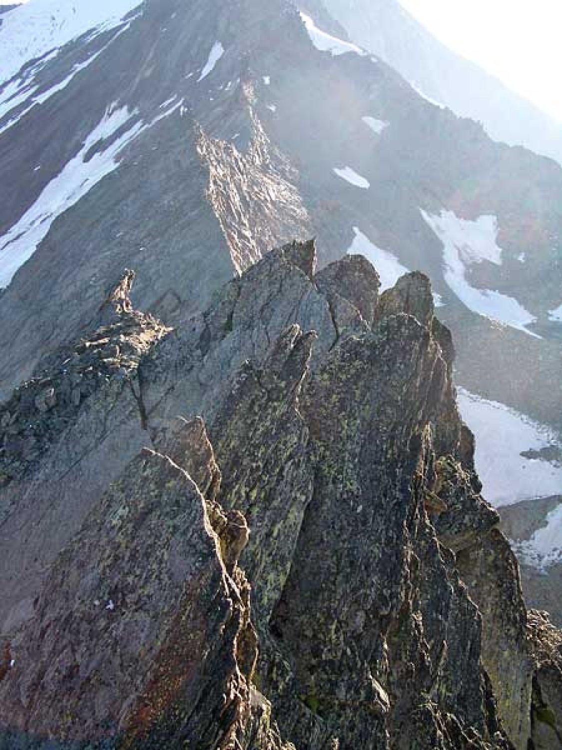 nun folgt der interssanteste teil des grates: der abstieg zur senke 3301m. es handelt sich stellenweise um ziemlich ausgesetzte kletterei an sehr gutem fels, wobei man grundsätzlich immer den grat verfolgt. ein erster roter felsfinger wird sehr ausgesetzt auf der südseite umgangen, der letzte steilabbruch vor der senke auf der nordseite. ZS-, III, 1/2h