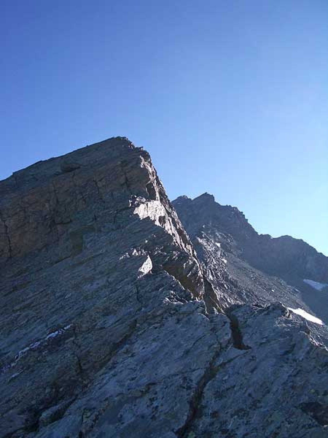 links der gipfelfalllinie führt eine offensichtliche, tief eingeschnittene runse in die felsen. man steigt nur zu beginn ganz kurz in der runse hoch, um gleich in die östlich liegenden felsen zu wechseln. einfache kletterei in bestem fels führt auf den grat, über diesen zum gipfel (3396m). II, 1/2h